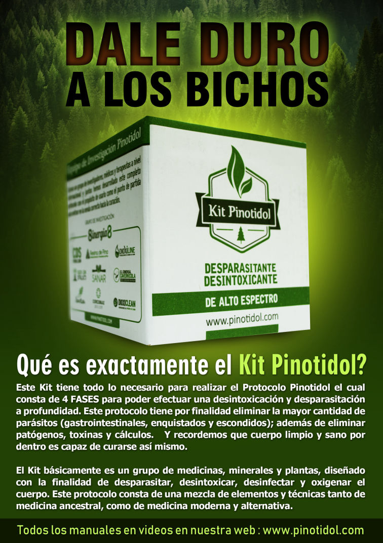 El Protocolo Mixto Pinotidol consta de 4 FASES para efectuar una desintoxicación y desparasitación a profundidad. Este protocolo alternativo tiene por finalidad eliminar la mayor cantidad de parásitos (gastrointestinales, enquistados y escondidos), además de eliminar patógenos, toxinas y cálculos, ya que un cuerpo limpio y sano por dentro es capáz de curarse así mismo. Más abajo detallamos todo sobre este completo, seguro y efectivo procedimiento.